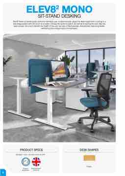 Elev82 Mono sit-stand desks allow the individual user to electronically adjust the desk height from a sitting to a standing position with the touch of a button. Having the option to stand, as well as sit during the work day has been proven not only to benefit the health of the user but also of the business, dramatically improving health, well-being and energy levels of employees.