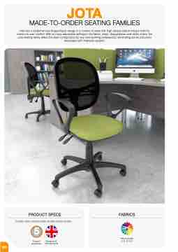 Jota has a traditional oval shaped back design in a number of sizes with high density seat and back foam for maximum user comfort. With so many adjustable settings in the fabric, mesh, draughtsman and visitor chairs, the Jota seating family offers the ideal configuration for any hard-working professional, eliminating aches and pains associated with improper support.