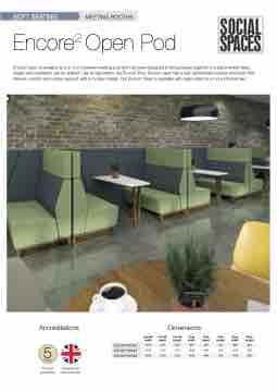 Encore2 open is available as a 2, 4 or 6 person meeting pod and has been designed to bring people together in a place where ideas, insight and inspiration can be shared. Like its big brother the Encore2 Pod, Encore2 open has a fully upholstered cushion and back that delivers comfort and lumbar support with a modern design, but Encore2 Open is available with open sides for a more informal feel.