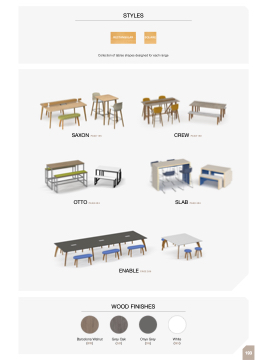 STYLES RECTANGULAR SQUARE Collection of tables shapes designed for each range SAXON PAGE 196 CREW PAGE 198 OTTO PAGE 202 SLAB PAGE 204 ENABLE PAGE 206 WOOD FINISHES Barcelona Walnut (BW) Grey Oak Onyx Grey White (GO) (OG) (WH) 193