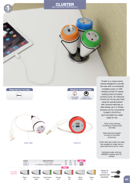 Cluster is a unique power module designed to provide the user with a conveniently locatable power or USB charging socket for casual seating areas and aother working zones. An individual module can be securely fixed using the special bracket with optional cable tidy, or alternatively up to 3 Cluster modules can be conveniently located in the 80mm grommet table top cradle ready for use.